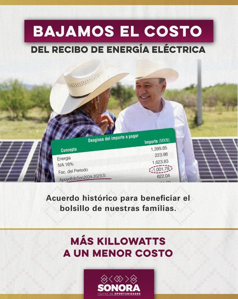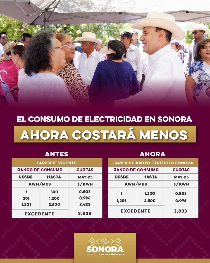 - El acuerdo alcanzado por el gobernador Alfonso Durazo Montaño con la CFE para el subsidio de la luz en todo Sonora, permite generar ahorros de 30, 40 y 50 por ciento en el pago de los recibos en los hogares. Además, se amplía a siete meses el periodo de tarifa especial 1F, del 1 de abril al 31 de octubre.