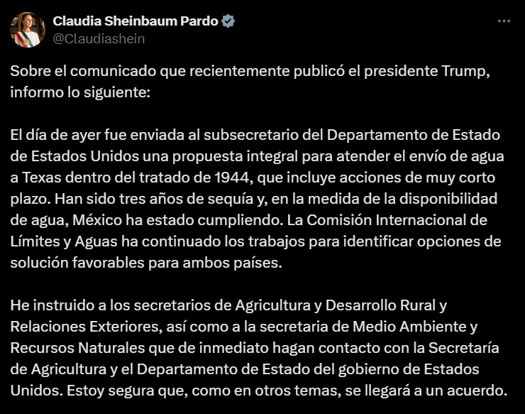 Tras esta nueva amenaza de sanciones de Trump que difundió en sus redes sociales, también por esta vía respondió la mandataria mexicana: “han sido tres años de sequía y, en la medida de la disponibilidad del agua, México ha estado cumpliendo. La Comisión Internacional de Límites Aguas ha continuado los trabajos para identificar opciones de solución favorables para ambos países”.