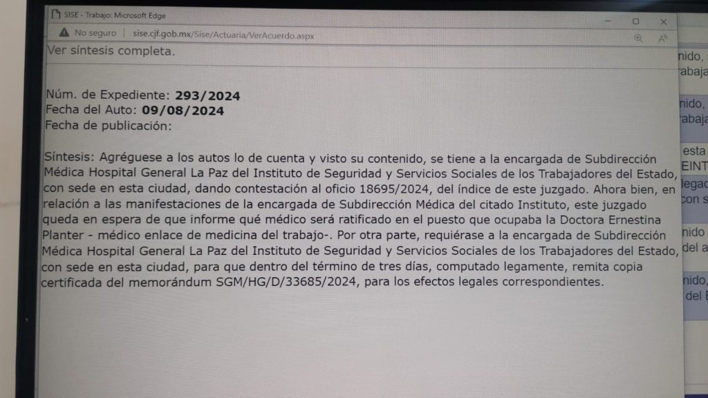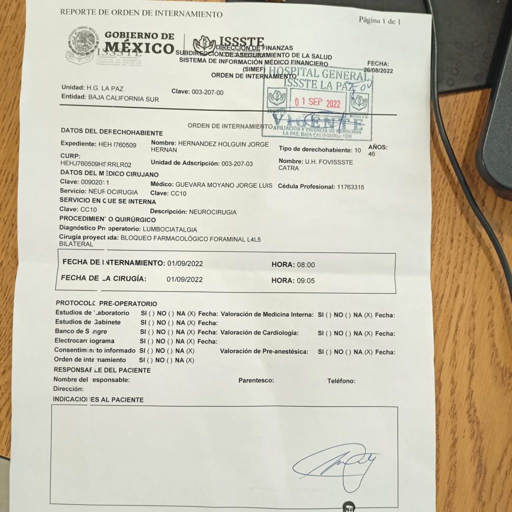 El diagnóstico fue discopatía lumbar; sin embargo, debido a la pandemia por Covid cerraron el Área de Especialidades del ISSSTE en La Paz, Baja California Sur dependiente de la Delegación del Estado de Sinaloa.