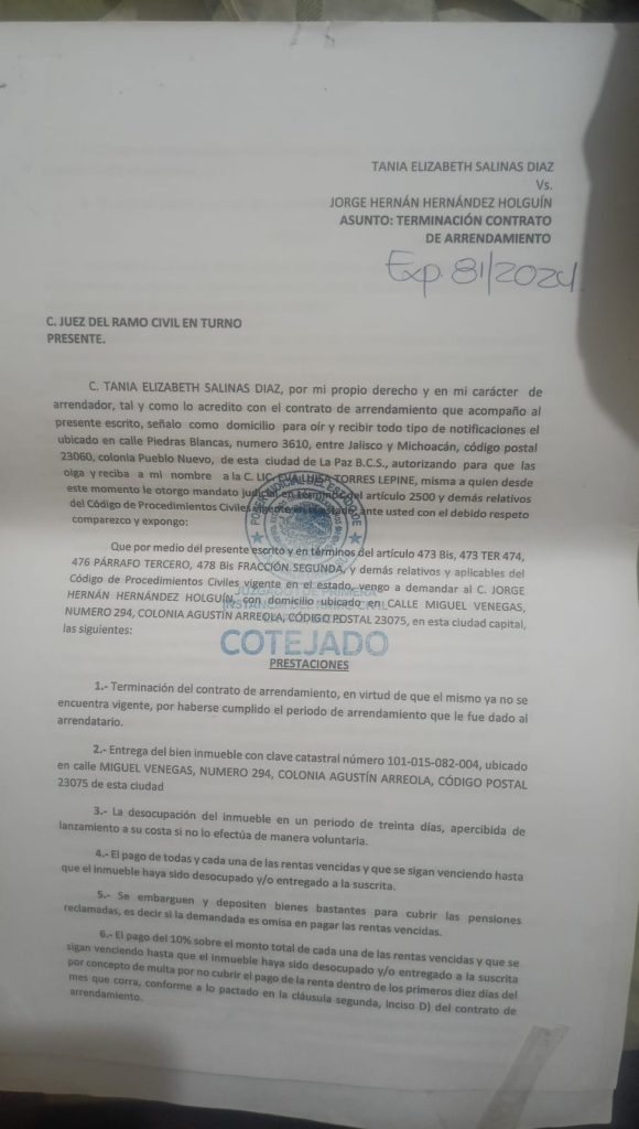 Expone además que «en ocasiones me cortan la.luz y duro días sin poder pagarla, actualmente tengo cortada el agua, ya perdí mi carro, vendí refrigerador, lavadora, computadora y ropa para poder subsistir ya que soy originario de Hermosillo, Sonora y no tengo familia en La Paz donde radico actualmente por motivos de trabajo».