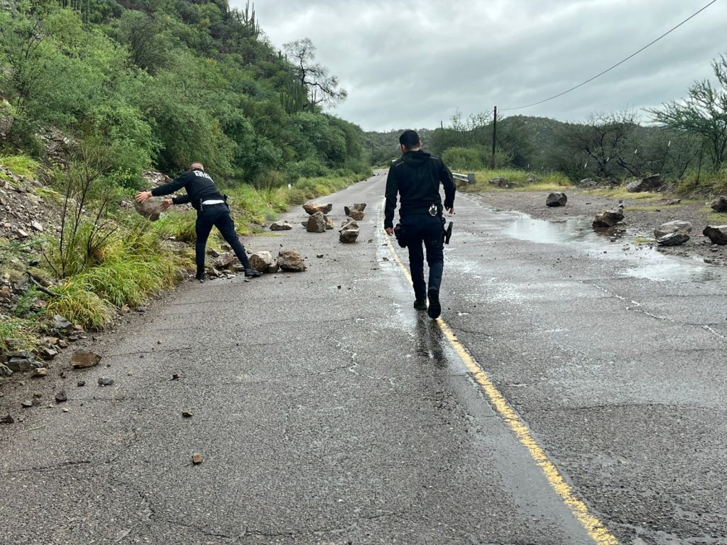 En caminos de la sierra de Sonora y Ruta del Río Sonora, la Policía Estatal mantiene patrullajes preventivos e identifican tramos afectados por deslaves para despejar las rutas, retirando las piedras que caen por las precipitaciones registradas en este sector.