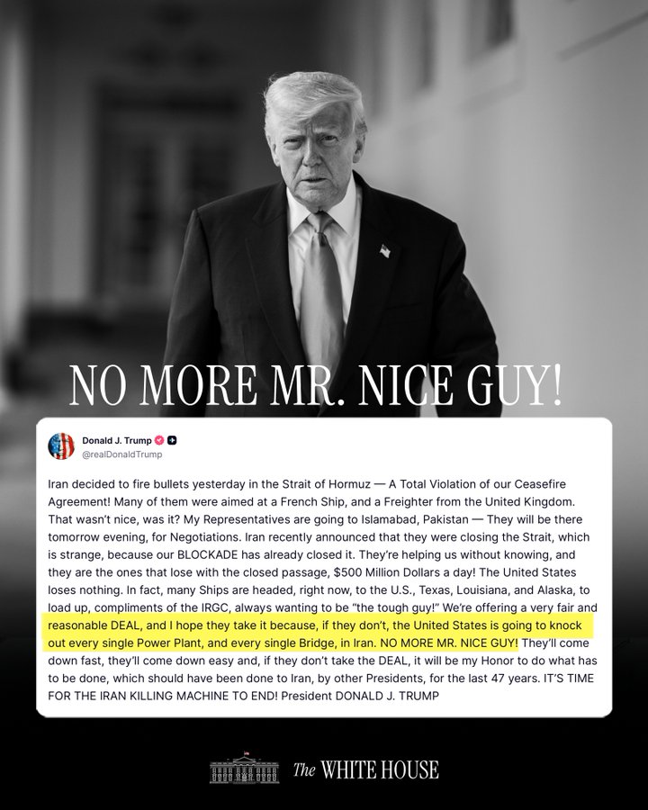 «…Estamos ofreciendo un ACUERDO muy justo y razonable, y espero que lo acepten porque, si no lo hacen, Estados Unidos va a destruir cada Central Eléctrica y cada Puente en Irán. SE ACABÓ EL SEÑOR BUEN CHICO…» – Presidente Donald J. Trump